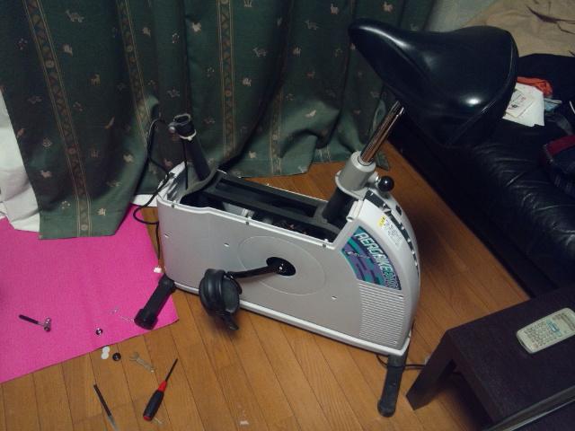 エアロバイクEZ101 2013年01月16日 健康 3 最近リバウンド絶好調宣言なのにもかかわらず、お家に帰ると外が寒くてジョギングする気にもなりません。 で、こんなんをヤフ億でぽちったです。 エアロバイクEZ101 コナミスポーツクラブでも使われてるらしい?健康器具です。 定価では手が出ませんが、ヤフオクなら買えます(`・ω・´) でも、中古品ということもあって、なにやら異音が… 「どうゆうこと?静粛性がウリではないの?」 「電気系統はまともに動いてるからとりあえずバラすべ?」 で、我が家に来た中古品はまずこうなります(笑) もっとばらします。 原因究明です。 自転車で言うBB(ボトムブラケット)部分のリテーナーが粉砕されておりました。 それが原因でシャフトも削れており、割れた鋼球が噛み込む度に「ゴリゴリ」とひどい音をたてておりました。 早速代替パーツを注文したいところですが、メーカーに連絡してもパーツ単体では売ってくれないらしくサービスマンが出張してくる事になっているそうです。 まあ、普通に考えたら10kは飛んでいきますよね~f^^; で、ココまでばらしたのなら自分で直してしまえ!という事で、自転車パーツを「サイクルベースあさひ」に注文… あ、もちろん普通には直しませんよ! もう少ししたらグレードアップした「EZ101」をご披露できるかと思いますのでしばらくお待ちください( ̄ー ̄) [0回]